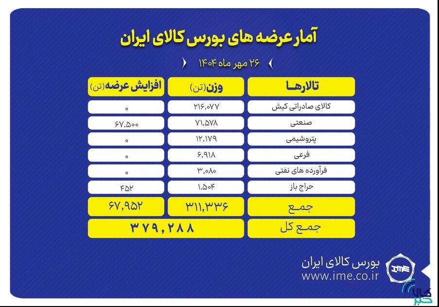 عصر معدن- تالارهای بورس کالای ایران در اولین روز هفته (شنبه ۲۶ مهر ماه) میزبان عرضه ۳۷۹ هزار و ۲۸۸ تن انواع محصول است. بیشترین حجم عرضه امروز متعلق به تالار صادراتی کیش است به طوری که در این تالار ۲۱۶ هزارتن تن محصول روی تابلو می رود.
