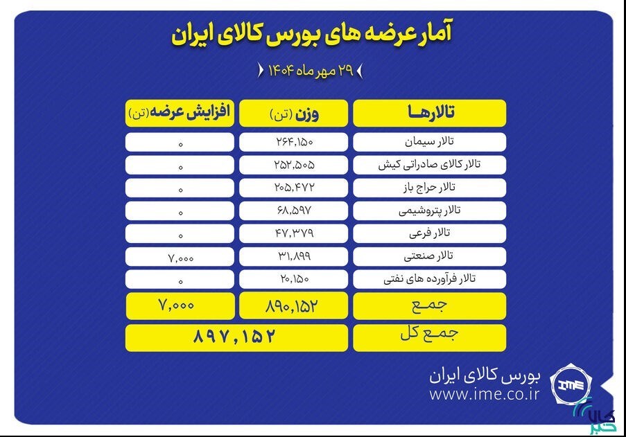 عصر معدن- تالارهای بورس کالای ایران امروز سهشنبه ۲۹ مهر ماه میزبان عرضه ۸۹۷ هزار و ۱۵۲ تن انواع محصول است. بیشترین حجم عرضه امروز از آن تالار سیمان است.