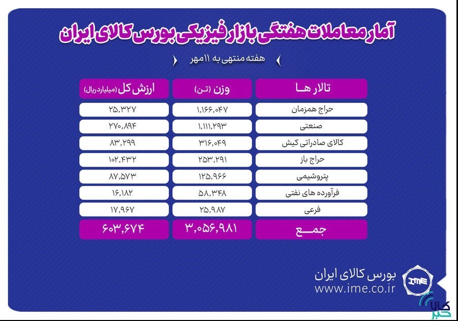 عصر معدن- در معاملات هفته گذشته بازار فیزیکی بورس کالای ایران ۳ میلیون و ۵۶ هزار و ۹۸۱ تن انواع محصول به ارزش ۶۰.۴ هزار میلیارد تومان دادوستد شد.;