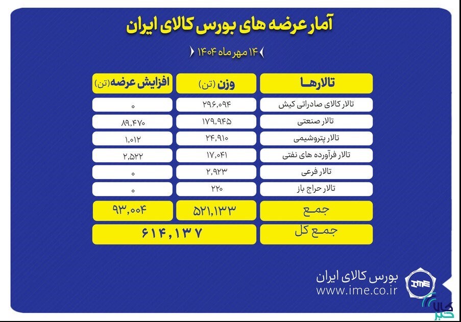 عصر معدن- تالارهای بورس کالای ایران امروز دوشنبه ۱۴ مهر ماه میزبان عرضه ۶۱۴ هزار و ۱۳۷ تن انواع محصول است. بیشترین عرضه امروز متعلق به تالار صادراتی و بعد از آن تالار صنعتی است.;