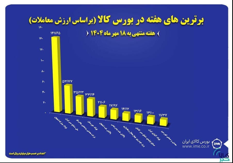 به گزارش پایگاه خبری «عصرمعدن» به نقل از کالاخبر، برترین های بورس کالای ایران در هفته منتهی به 18 مهر ماه براساس ارزش فروش شرکت ها در بازار فیزیکی به شرح زیر است: