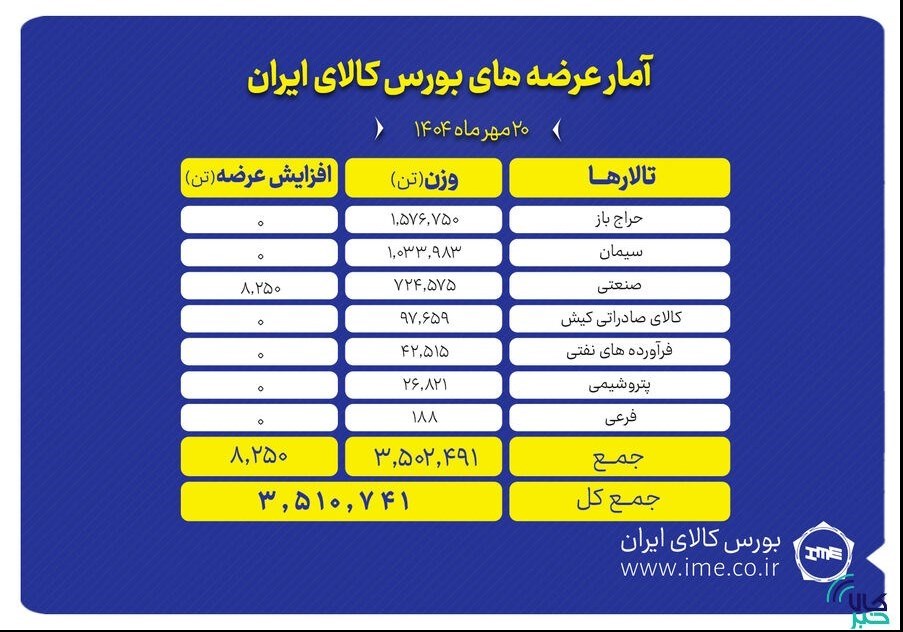عصر معدن- تالارهای بورس کالای ایران امروز یکشنبه ۲۰ مهرماه میزبان عرضه ۳ میلیون و ۵۱۰ هزار و ۷۴۱ تن محصول است.;