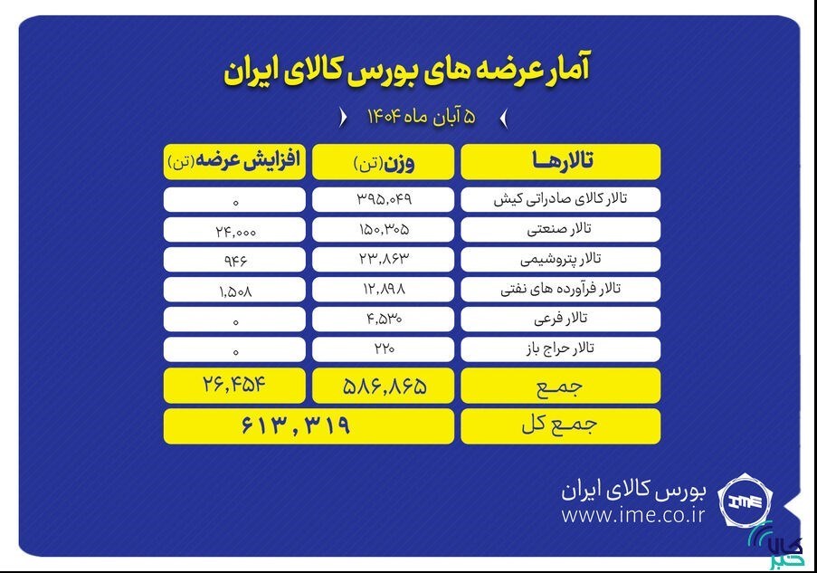 عصر معدن- تالارهای بورس کالای ایران امروز دوشنبه ۵ آبان ماه میزبان عرضه ۶۱۳ هزار و ۳۱۹ تن انواع محصول است و تالار صادراتی کیش با عرضه ۳۹۵ هزار تن انواع محصول پیشتاز عرضه های امروز است.;