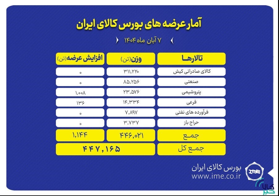 عصر معدن- تالارهای بورس کالای ایران امروز چهارشنبه ۷ آبان ماه میزبان عرضه ۴۴۷ هزار و ۱۶۵ تن انواع محصول است.;