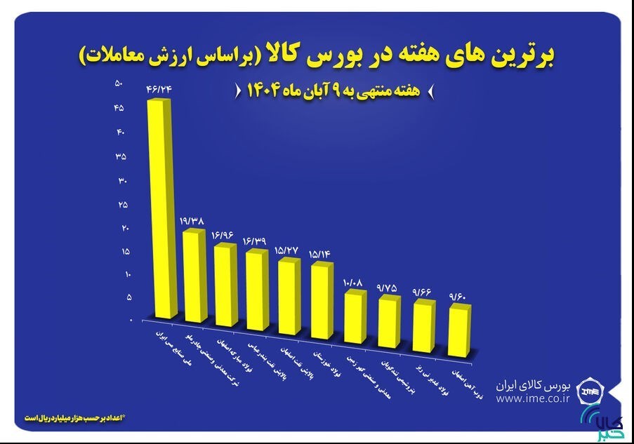 به گزارش پایگاه خبری «عصرمعدن» به نقل از کالاخبر، برترین های بورس کالای ایران در هفته منتهی به 9 آبان ماه براساس ارزش فروش شرکت ها در بازار فیزیکی به شرح زیر است: