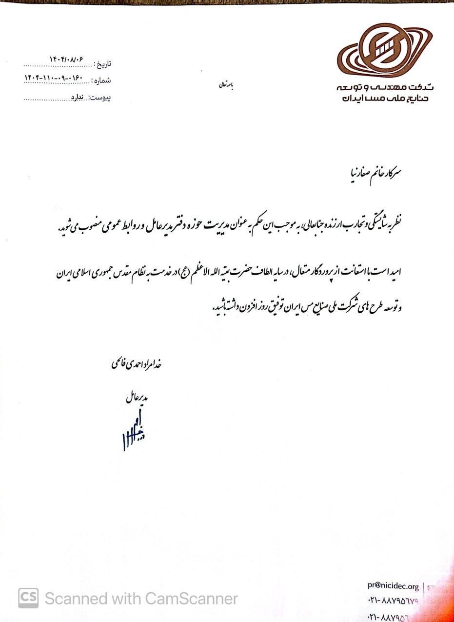 عصر معدن- مدیرعامل شرکت مهندسی و توسعه صنایع ملی مس ایران طی حکمی نفیسه صفارنیا را به عنوان مدیر حوزه مدیرعامل و روابط عمومی این شرکت منصوب کرد.;