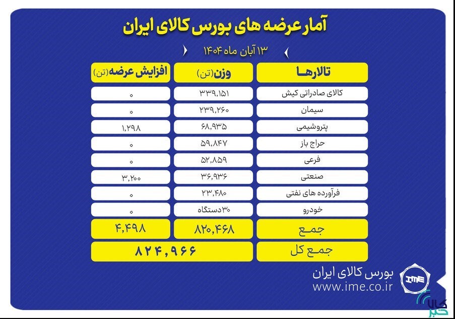عصر معدن- تالارهای بورس کالای ایران امروز سهشنبه ۱۳ آبان ماه میزبان عرضه ۸۲۴ هزار و ۹۶۶ تن انواع محصول است. بیشترین حجم عرضه امروز از آن تالار صادراتی است.;