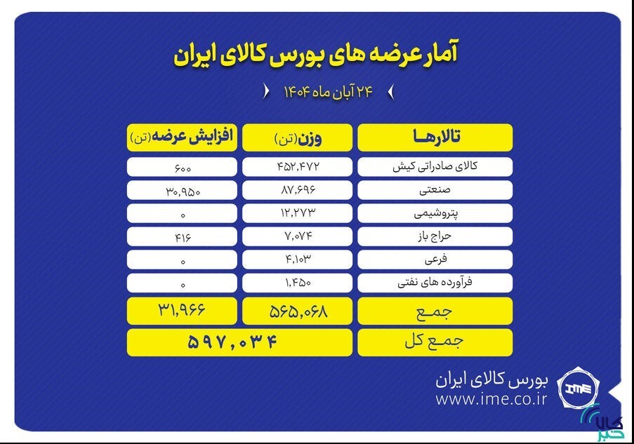 عصر معدن- تالارهای بورس کالای ایران در اولین روز هفته (شنبه ۲۴ آبان ماه) میزبان عرضه ۵۹۷ هزار و ۳۴ تن انواع محصول است. بیشترین حجم عرضه امروز متعلق به تالار صادراتی کیش است به طوری که در این تالار بیش از ۴۵۳ هزار تن محصول روی تابلو می رود.;