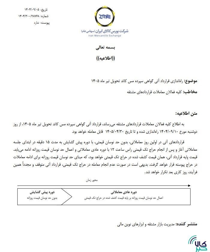 به گزارش پایگاه خبری «عصر معدن» به نقل از کالاخبر،بر اساس اعلام مدیریت بازار مشتقه و ابزارهای نوین مالی بورس کالا، قراردادهای آتی در اولین روز معاملاتی، بدون حد نوسان قیمتی، با دوره پیش گشایش به مدت ١٥ دقیقه در ابتدای جلسه معاملاتی آغاز و پس از انجام حراج تک قیمتی راس ساعت ١٢ با دوره عادی معاملاتی و اعمال حد نوسان قیمت روزانه ادامه می یابد.