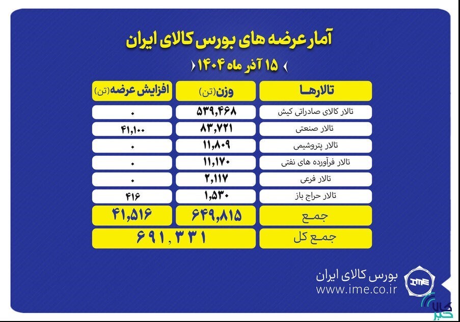 عصر معدن- تالارهای بورس کالای ایران امروز شنبه ۱۵ آذرماه میزبان عرضه ۶۹۱ هزار و ۳۳۱ تن انواع محصول است.;