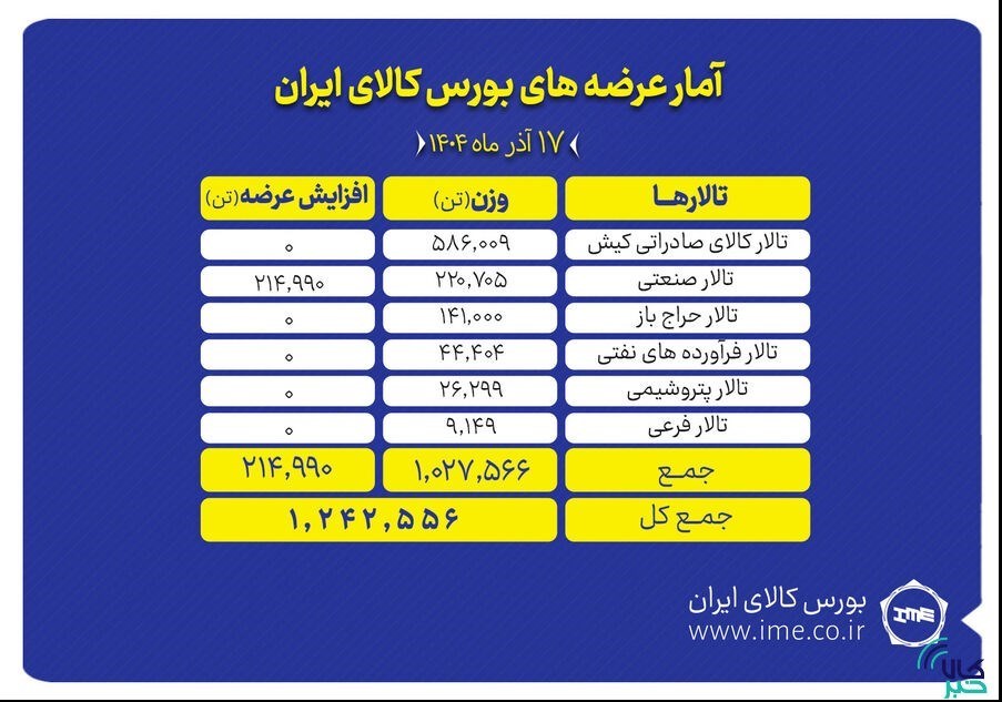 عصر معدن- تالارهای بورس کالای ایران امروز دوشنبه ۱۷ آذر ماه میزبان عرضه یک میلیون و ۲۴۲ هزار و ۵۵۶ تن انواع محصول است و تالار صادراتی کیش با عرضه بیش از ۵۸۶ هزار تن انواع محصول پیشتاز عرضه های امروز است.;