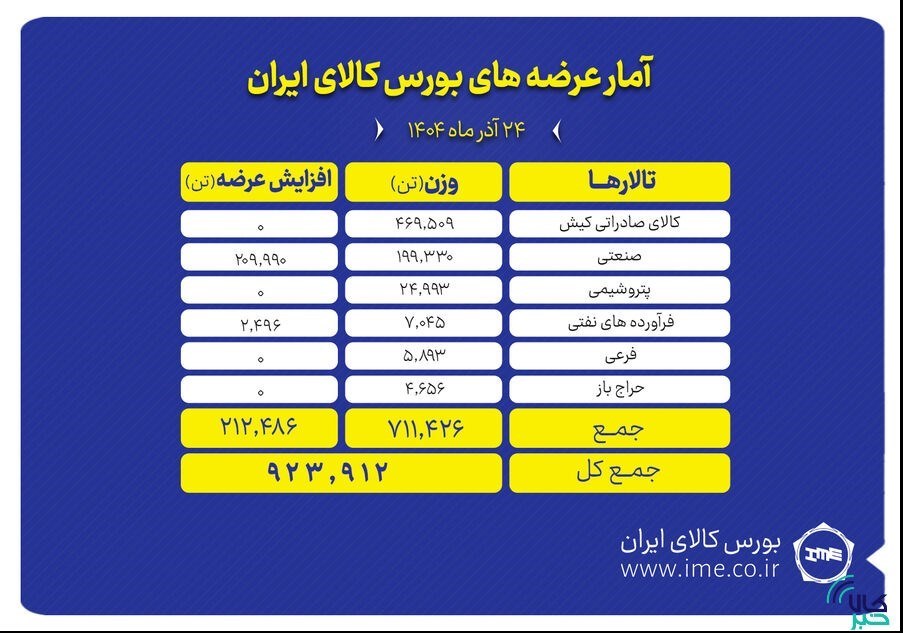 عصر معدن- تالارهای بورس کالای ایران امروز دوشنبه ۲۴ آذر ماه میزبان عرضه ۹۲۳ هزار و ۹۱۲ تن انواع محصول است.;