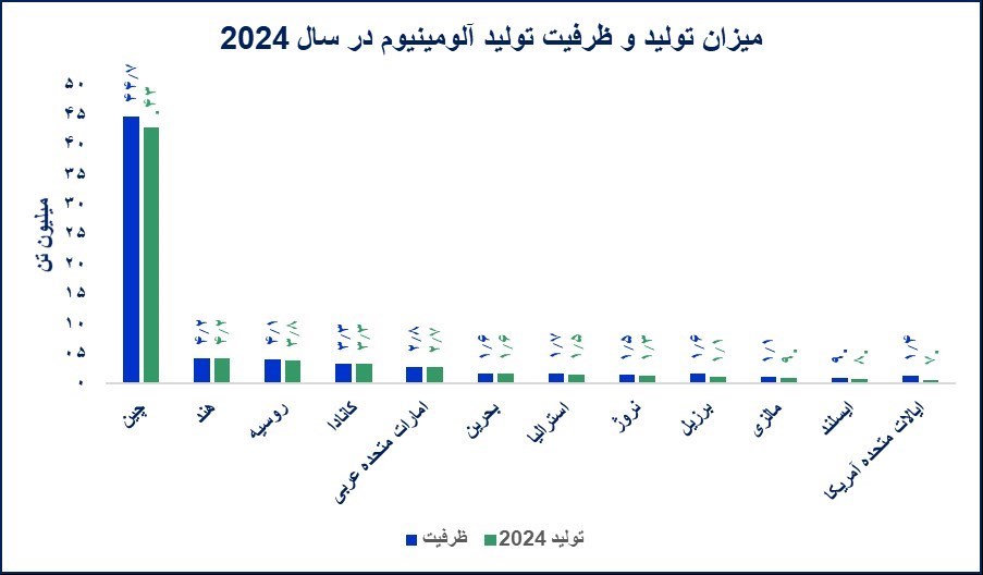 بر اساس گزارش سازمان زمین‌شناسی ایالات متحده (USGS)، در سال 2024 از 64.8 میلیون تن تولید آلومینیوم در جهان چین با تولید حدود 43 میلیون تن آلومینیوم، با فاصله‌ای چشمگیر جایگاه بزرگ‌ترین تولیدکننده این فلز را در جهان به خود اختصاص داده است. پس از چین، هند با تولید تقریبی 4.2 میلیون تن و روسیه با حدود 3.8 میلیون تن، به‌ترتیب در رتبه‌های دوم و سوم تولید جهانی قرار دارند. این اختلاف قابل‌توجه میان چین و سایر تولیدکنندگان، نقش تعیین‌کننده سیاست‌های صنعتی، انرژی و زیست‌محیطی این کشور را در جهت‌دهی به بازار جهانی آلومینیوم برجسته می‌کند. تمرکز بالای تولید در چند کشور محدود، به‌ویژه چین، سبب شده است بازار آلومینیوم در برابر ریسک‌های ژئوپلیتیک، محدودیت‌های انرژی و تغییرات سیاست‌گذاری، حساسیت بالایی داشته باشد؛ عاملی که در سال‌های اخیر یکی از محرک‌های اصلی نوسانات قیمتی این فلز محسوب می‌شود.
