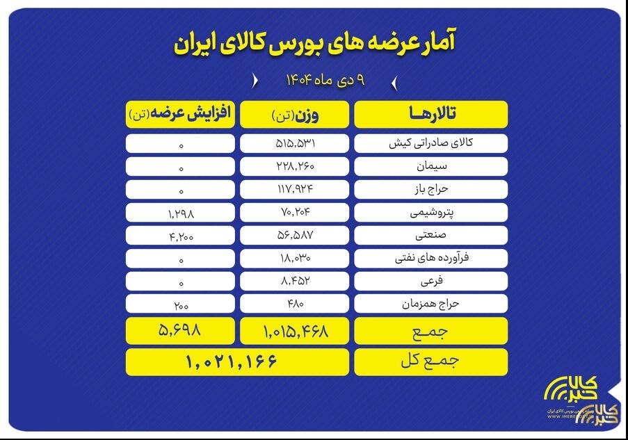عصر معدن- تالارهای بورس کالای ایران امروز سهشنبه ۹ دی ماه میزبان عرضه یک میلیون و ۲۱ هزار و ۱۶۶ تن انواع محصول است.;