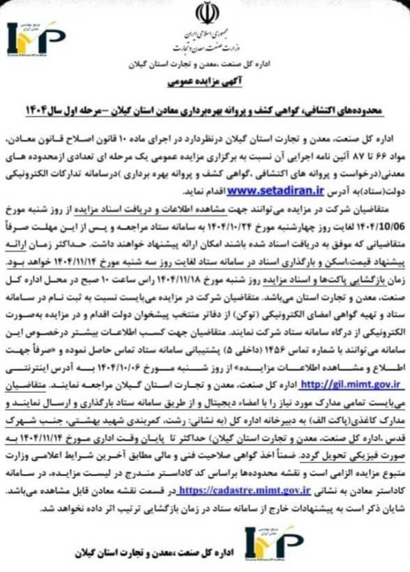 خبر دیگر اینکه محدوده‌های اکتشافی، گواهی کشف و پروانه بهره برداری معادن استان گیلان هم به مزایده گذاشته شد.
