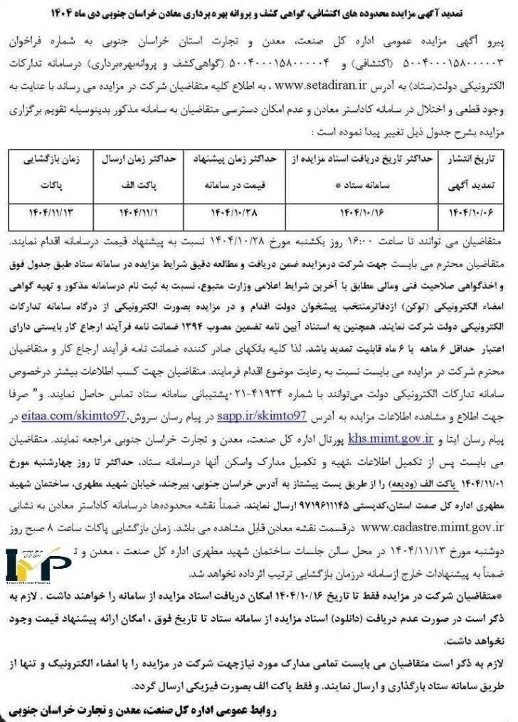به گزارش پایگاه خبری «عصر معدن» به نقل از صدا و سیما، پیرو آگهی مزایده عمومی اداره کل صنعت معدن و تجارت استان خراسان جنوبی گواهی کشف و پروانه بهره برداری در سامانه تدارکات الکترونیکی دولت استاد به آدرس www.setadiran.ir، به اطلاع کلیه متقاضیان شرکت در مزایده می‌رساند با عنایت به وجود قطعی و اختلال در سامانه کاداستر معادن و عدم امکان دسترسی متقاضیان به سامانه مذکور بدینوسیله تقویم برگزاری مزایده به شرح ذیل تغییر پیدا نموده است.