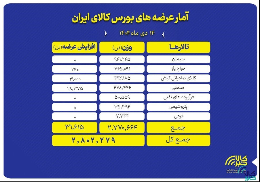 عصر معدن- تالارهای بورس کالای ایران امروز یکشنبه ۱۴ دی ماه میزبان عرضه ۲ میلیون و ۸۰۲ هزار و ۲۷۹ تن انواع محصول است.;