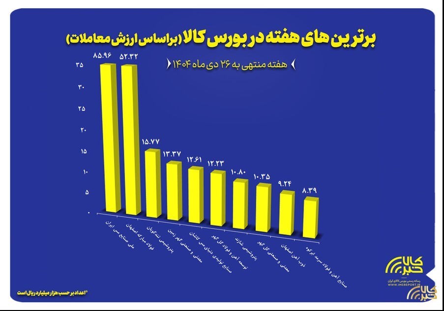 عصر معدن- آمار معاملات بازار فیزیکی بورس کالای ایران نشان می دهد در هفته منتهی به ۲۶ دی ماه حدود ۲ میلیون و ۳۴۲ هزار تن انواع کالا و محصول به ارزش بالغ بر ۵۲.۹ هزار میلیارد تومان معامله شد. همچنین ارزش معاملات ۱۰ شرکت برتر به بیش از ۲۳.۱ هزار میلیارد تومان رسید.;