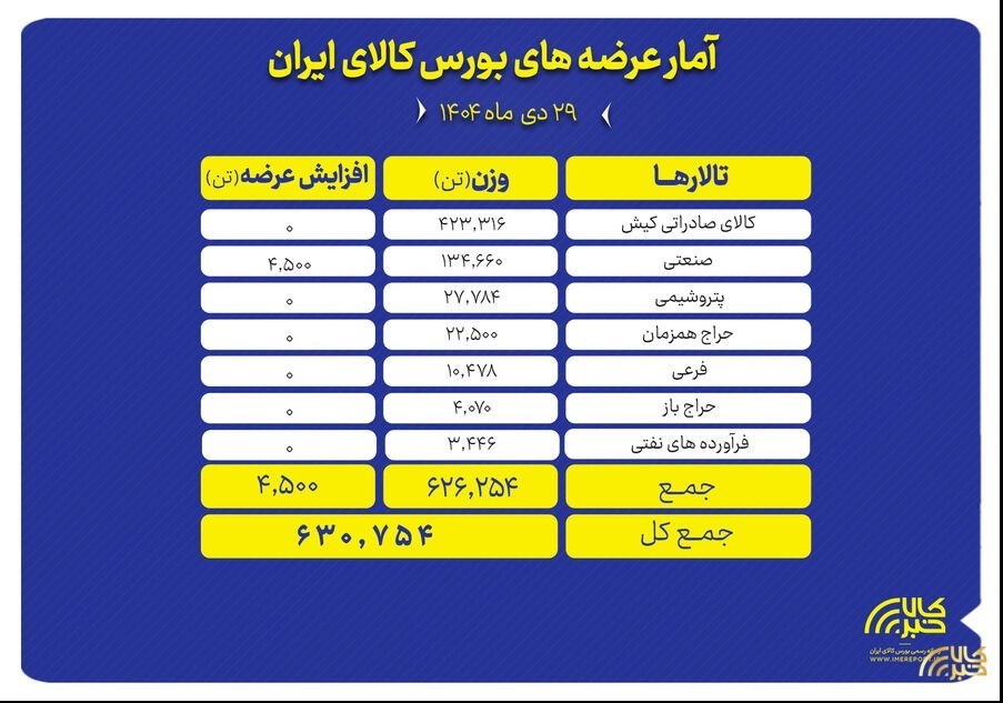 عصر معدن- تالارهای بورس کالای ایران امروز دوشنبه ۲۹ دی ماه میزبان عرضه ۶۳۰ هزار و ۷۵۴ تن انواع محصول است.;