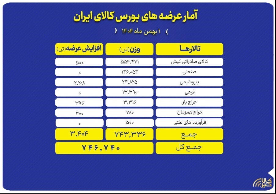 عصر معدن- تالارهای بورس کالای ایران امروز چهارشنبه اول بهمن ماه میزبان عرضه ۷۴۶ هزار و ۷۴۰ تن انواع محصول است.;