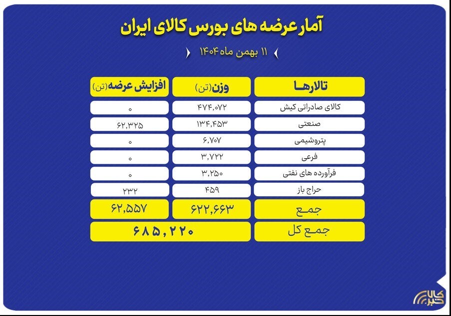 عصر معدن- تالارهای مختلف بورس کالای ایران در نخستین روز هفته (شنبه ۱۱ بهمن ماه) میزبان عرضه ۶۸۵ هزار و ۲۲۰ تن محصول هستند.;