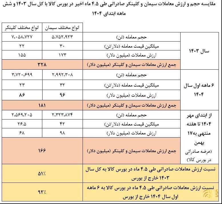 همچنین بررسی این آمار در سال 1404 نشان می دهد درآمد دلاری صادرات این محصولات از طریق رینگ صادراتی بورس کالا طی 4.5 ماه اخیر به اندازه 92 درصد درآمد حاصل از فروش 6.7 میلیون تنی آنها طی 6 ماه ابتدای 1404 بوده است.