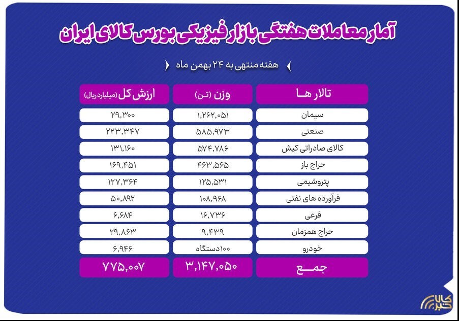 عصر معدن- در معاملات هفته گذشته بازار فیزیکی بورس کالای ایران ۳ میلیون و ۱۴۷ هزار و ۵۰ تن انواع محصول به ارزش ۷۷.۵ هزار میلیارد تومان دادوستد شد.;