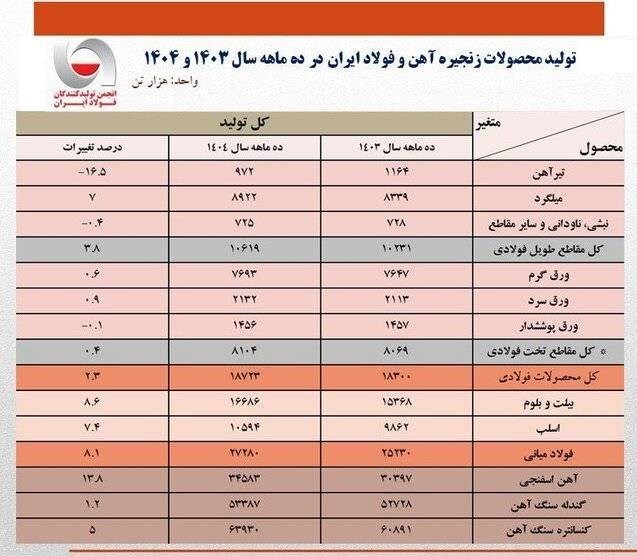عصر معدن- بر اساس آمارهای منتشرشده از سوی انجمن تولیدکنندگان فولاد ایران، حجم تولید فولاد کشور با تداوم روندی صعودی همراه بوده و در ۱۰ ماهه ابتدایی سال نیز تولید کل محصولات فولادی با رشد ۲.۳ درصدی به بیش از ۱۸.۷ میلیون تن رسیده است.;