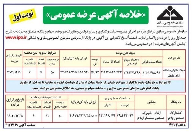 آگهی کامل عرضه در پایگاه اینترنتی سازمان خصوصیسازی در دسترس است.