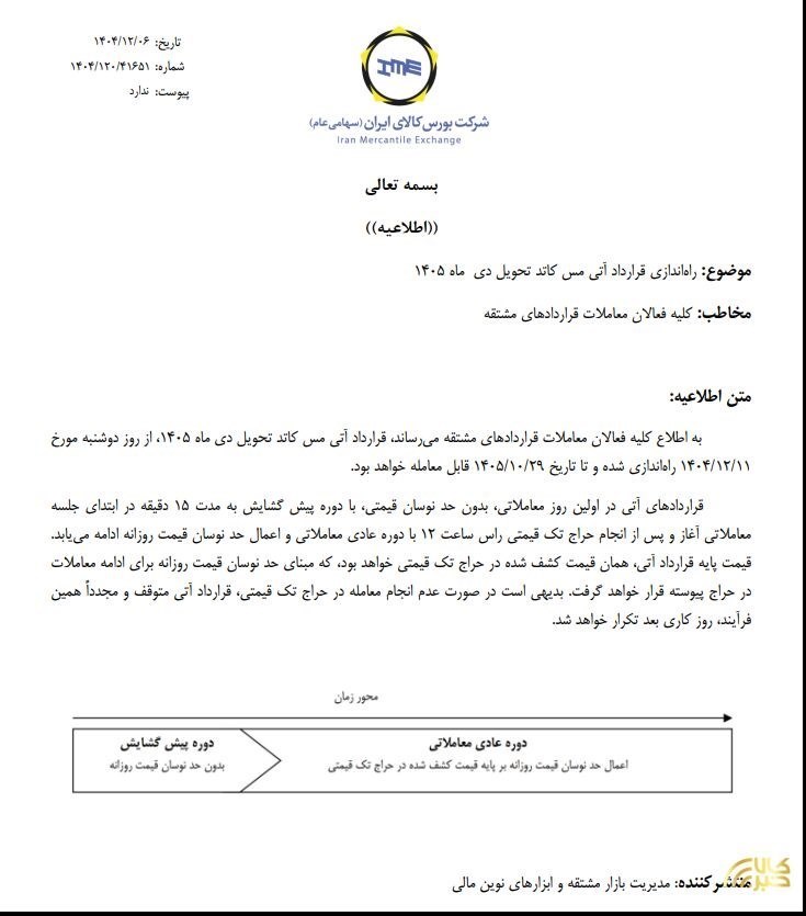 به گزارش پایگاه خبری «عصر معدن»  به نقل از  کالاخبر ، بر اساس این اطلاعیه قرارداد آتی مس کاتد تحویل دی ماه 1405 از روز دوشنبه 11 اسفند ماه راه اندازی شده و تا تاریخ 29 دی 1405 قابل معامله خواهد بود.