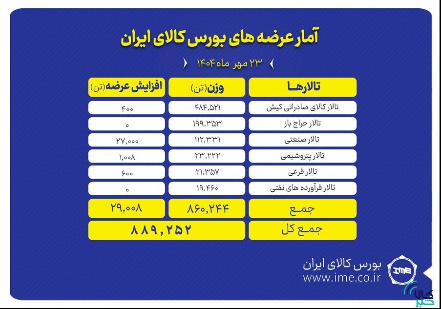 عصر معدن-تالارهای بورس کالای ایران امروز چهارشنبه ۲۳ شهریور ماه میزبان عرضه ۸۸۹ هزار و ۲۵۲ تن انواع محصول است. بیشترین عرضه امروز در تالار صادراتی است.;