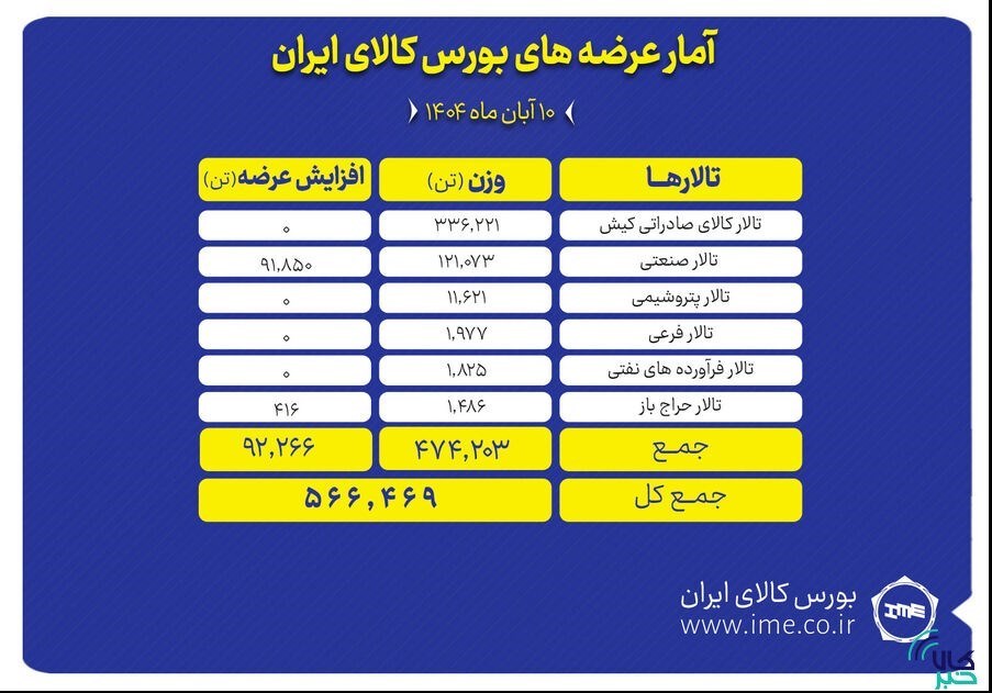 عصر معدن- تالارهای بورس کالای ایران در اولین روز هفته (شنبه ۱۰ آبان ماه) میزبان عرضه ۵۶۶ هزار و ۴۶۹ تن انواع محصول است. بیشترین حجم عرضه امروز متعلق به تالار صادراتی کیش است به طوری که در این تالار بیش از ۳۳۶ هزار تن محصول روی تابلو می رود.;