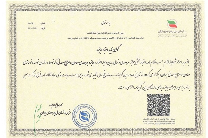 عصر معدن- گواهی تایید اعتبار جایزه بهره وری معادن و صنایع معدنی برای دوره ۵ ساله از سوی سازمان ملی بهرهوری صادر شد.;