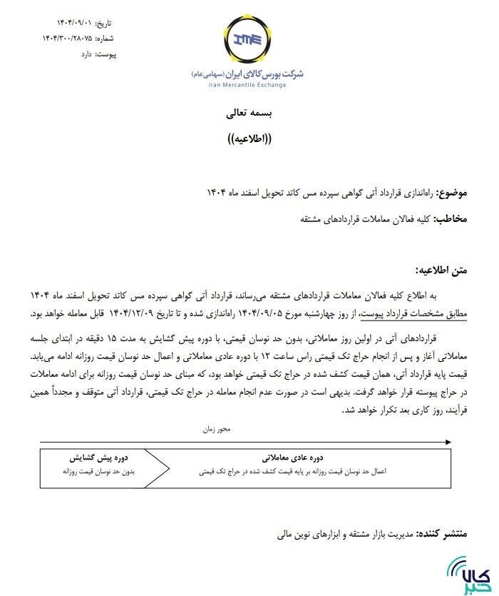 به گزارش پایگاه خبری «عصر معدن» به نقل از کالاخبر ،بر اساس اعلام مدیریت بازار مشتقه و ابزارهای نوین مالی بورس کالا، قراردادهای آتی در اولین روز معاملاتی، بدون حد نوسان قیمتی، با دوره پیش گشایش به مدت ١٥ دقیقه در ابتدای جلسه معاملاتی آغاز و پس از انجام حراج تک قیمتی راس ساعت ١٢ با دوره عادی معاملاتی و اعمال حد نوسان قیمت روزانه ادامه می یابد.