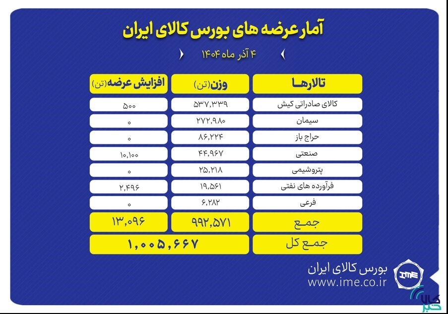 عصر معدن- تالارهای بورس کالای ایران امروز سه‌شنبه ۴ آذر ماه میزبان عرضه یک میلیون و ۵ هزار و ۶۶۷ تن انواع محصول است.;