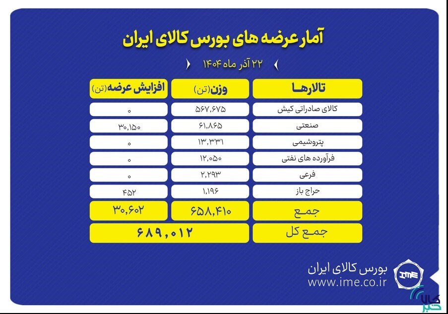 عصر معدن- تالارهای بورس کالای ایران امروز شنبه ۲۲ آذرماه میزبان عرضه ۶۸۹ هزار و ۱۲ تن انواع محصول است.;