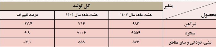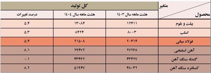 در مجموع مقایسه آمار هشت ماهه سال 1404 با سال قبل از آن نشان میدهد که رشد تولید در بخش مواد اولیه (کنسانتره، آهن اسفنجی) و محصولات میانی (بیلت و بلوم، اسلب) قوی بوده، اما کاهش تولید در بخشهای مصرفکننده انرژی (ورقهای سرد و گرم) و برخی مقاطع طویل، بر تولید کل محصولات فولادی تأثیر منفی خفیفی گذاشته است.