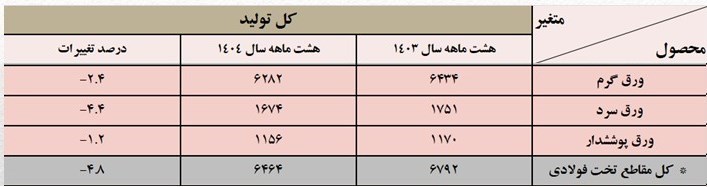 همچنین، با وجود نوسانات شدید در بخشهای مختلف، کل محصولات فولادی تولید شده در این مدت، تنها 1.1 درصد کاهش یافت و به 14 میلیون و 742 هزار تن رسید.