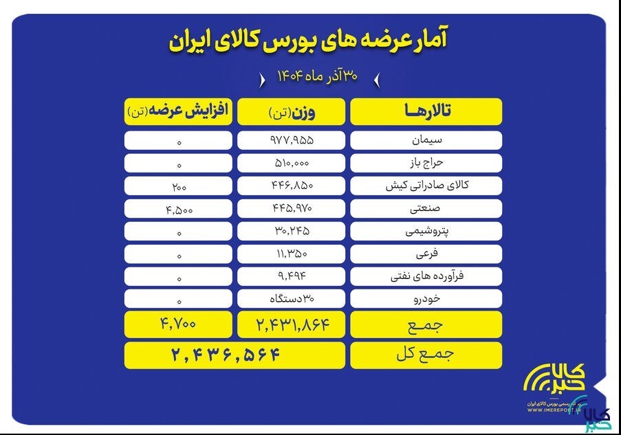 عصر معدن- تالارهای بورس کالای ایران امروز یکشنبه ۳۰ آذرماه میزبان عرضه ۲ میلیون و ۴۳۶ هزار و ۵۶۴ تن انواع محصول است.;