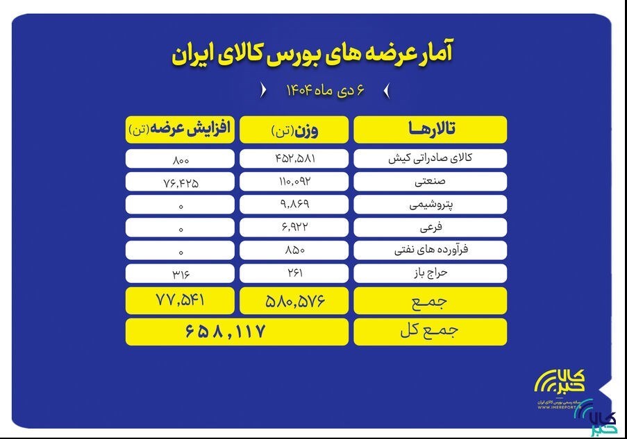 عصر معدن- تالارهای بورس کالای ایران امروز شنبه ۶ دی ماه میزبان عرضه ۶۵۸ هزار و ۱۱۷ تن انواع محصول است.;